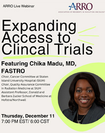 The Health Care Access and Advancement Subcommittee is excited to be hosting an upcoming webinar titled “Expanding Access to Clinical Trials” featuring Chika Madu, MD, FASTRO, on December 11 at 7:00 p.m. Eastern time. Dr. Madu serves as the Chair of the Community Engagement and Advocacy Committee as part of the ASTRO Health Care Access and Community Engagement (HACE) Council. She also serves as the Chair of the Cancer Committee and Quality Assurance Committee in Radiation Medicine at Staten Island University Hospital (SIUH) and is an Assistant Professor at the Donald and Barbara Zucker School of Medicine at Hofstra/Northwell. Join us for an important discussion on improving access and participation. Register today! |
