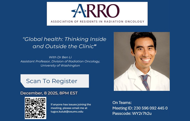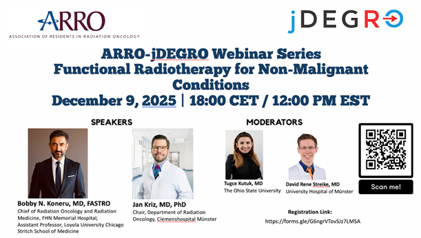 | We are excited to announce the first transatlantic ARRO-jDEGRO webinar, “Functional Radiotherapy for Nonmalignant Conditions,” taking place on December 9, 2025, at 12:00 p.m. Eastern time. This resident-led collaboration will feature Bobby N. Koneru, MD, FASTRO, and Jan Kriz, MD, PhD, who will discuss clinical applications of functional radiotherapy for nonmalignant conditions, including practical insights on patient selection and treatment approaches. Register and complete the brief pre-webinar survey. |