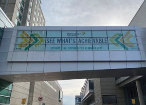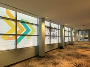 Exterior and interior window clings on the Sky Bridge connecting the Westin to the Convention Center.