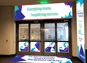 Amplify your company's presence with 2 single-sided window clings and 4 tables along the East and West Hallways from Main Lobby to the 100s Session Rooms.