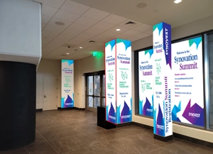 Located in the main lobby, these column wraps offer lots of space for your messaging and act as an entrance to welcoming attendees to the exhibition area and lobby.