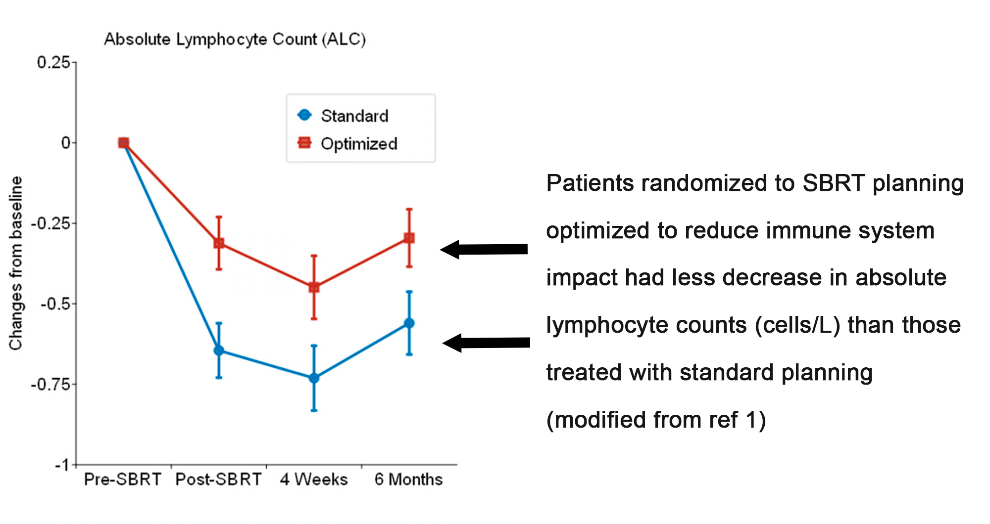 For example, in her team’s analysis of immune suppression after SBRT for early-stage lung cancer, the modeling was traditional, with input variables extracted from patient records correlated with output variables from the same patients’ charts. The end product is an equation with dosimetric variables that can be validated on other retrospective data sets. And, hey, why stop there? How about proving the model in a prospective randomized trial? The UVA team have done this — a modified figure from one of their papers:1