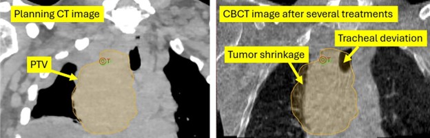 The ELI5 version1 is this: software is trained to identify deviations in patient setup that warrant clinician attention and might call for an adjustment of some kind. In the example figure above, modified from Neylon et al.,2coronal projections of a CBCT taken during a course of treatment are compared with the expected appearance based on the planning CT images. Deviations in the expected appearance of the tumor contour and normal tissues, e.g., the trachea, are quantified, and an alert is sent when there is a predicted difference in dose distribution above a specified threshold. An early prototype is rumored to have signaled the radiation oncologist